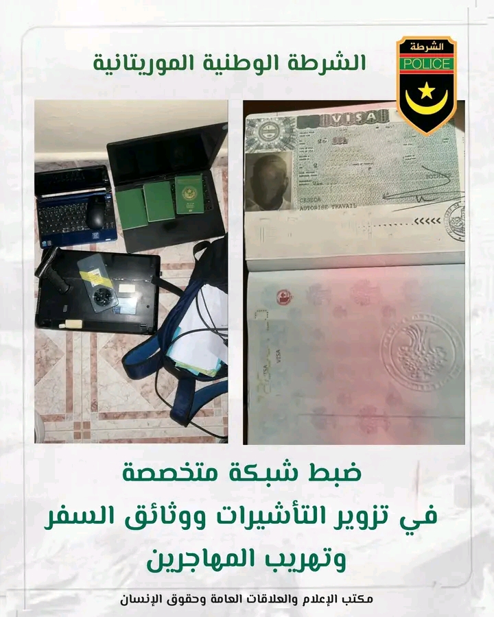 تمكنت فرقة البحث التابعة للمكتب المركزي لمكافحة تهريب المهاجرين والاتجار بالبشر، مساء الثلاثاء 11 نوفمبر 2025، من تفكيك شبكة متخصصة في تزوير التأشيرات ووثائق السفر تنشط في العاصمة نواكشوط.