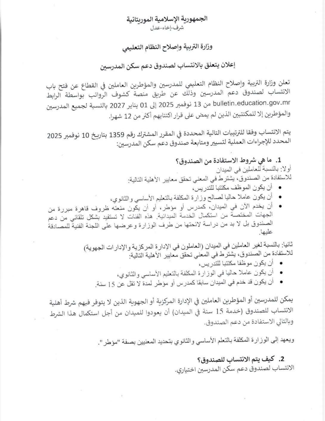 ويتم الانتساب وفقا للترتيبات المحددة في المقرر المشترك رقم 1359 بتاريخ 10 نوفمبر 2025 المحدد للإجراءات العملية لتسيير ومتابعة صندوق دعم سكن المدرسين