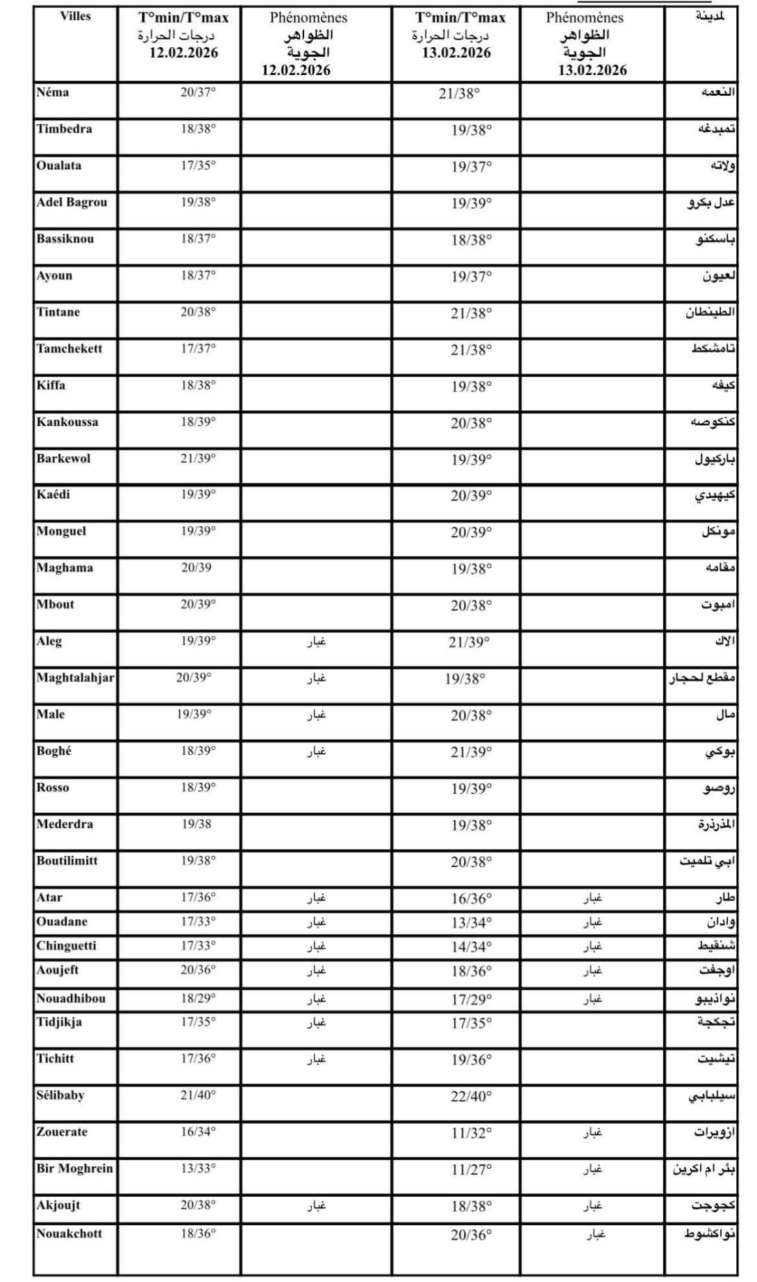 الهيئة وفي نشرة لها أكدت أن الرؤية ستتأثر محليًا بفعل الأتربة على آدرار وإنشيري وداخلت نواذيبو ولبراكنه وتكانت.