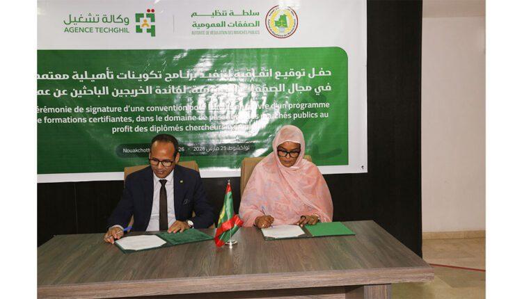 وقّعت سلطة تنظيم الصفقات العمومية، اليوم الأربعاء في نواكشوط، اتفاقية شراكة مع الوكالة الوطنية للتشغيل، لتنفيذ برنامج تكوين وتأهيل في مجال الصفقات العمومية لصالح الخريجين الباحثين عن عمل.