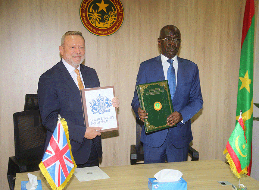 وقعت السلطات الموريتانية اليوم مع نظيرتها البريطانية مذكرة تفاهم متعلق بدعم قيمة الصادرات البريطانية إلى موريتانيا.