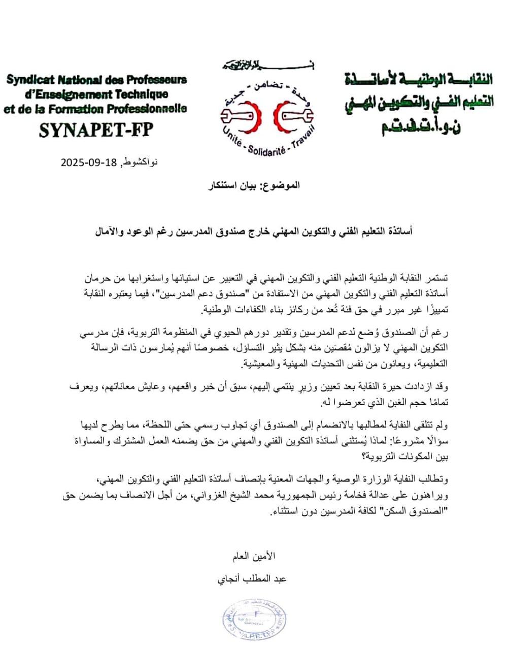 أعلنت النقابة الوطنية لأساتذة التعليم الفني والتكوين المهني، عن استنكارها "لحرمان أساتذة التعليم الفني والتكوين المهني من صندوق سكن المدرسين رغم الوعود والآمال."