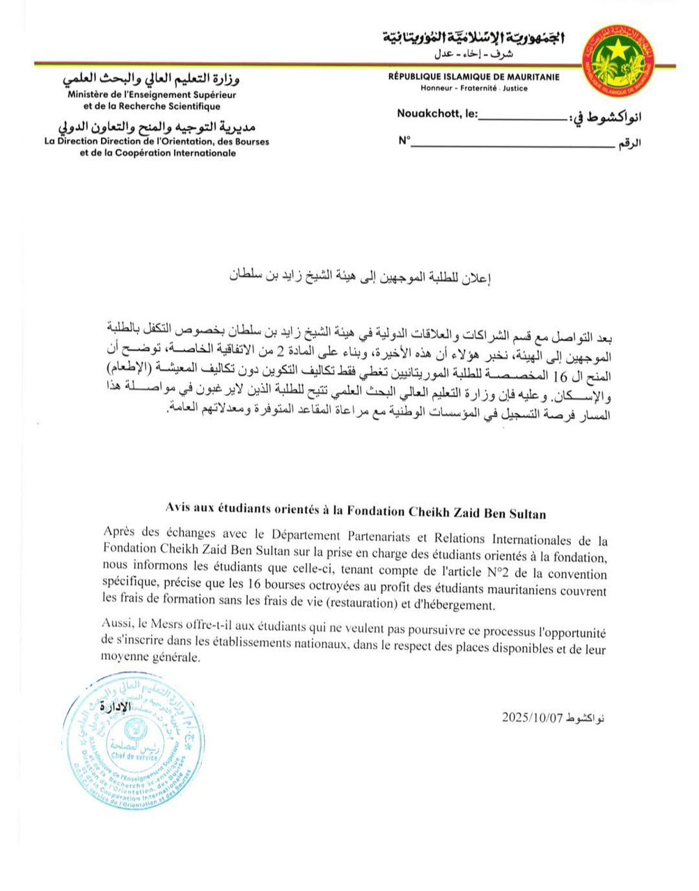 أعلنت وزارة التعليم العالي والبحث العلمي أن المنح المقدمة من هيئة الشيخ زايد بن سلطان للطلبة الموريتانيين، تغطي تكاليف التكوين فقط.