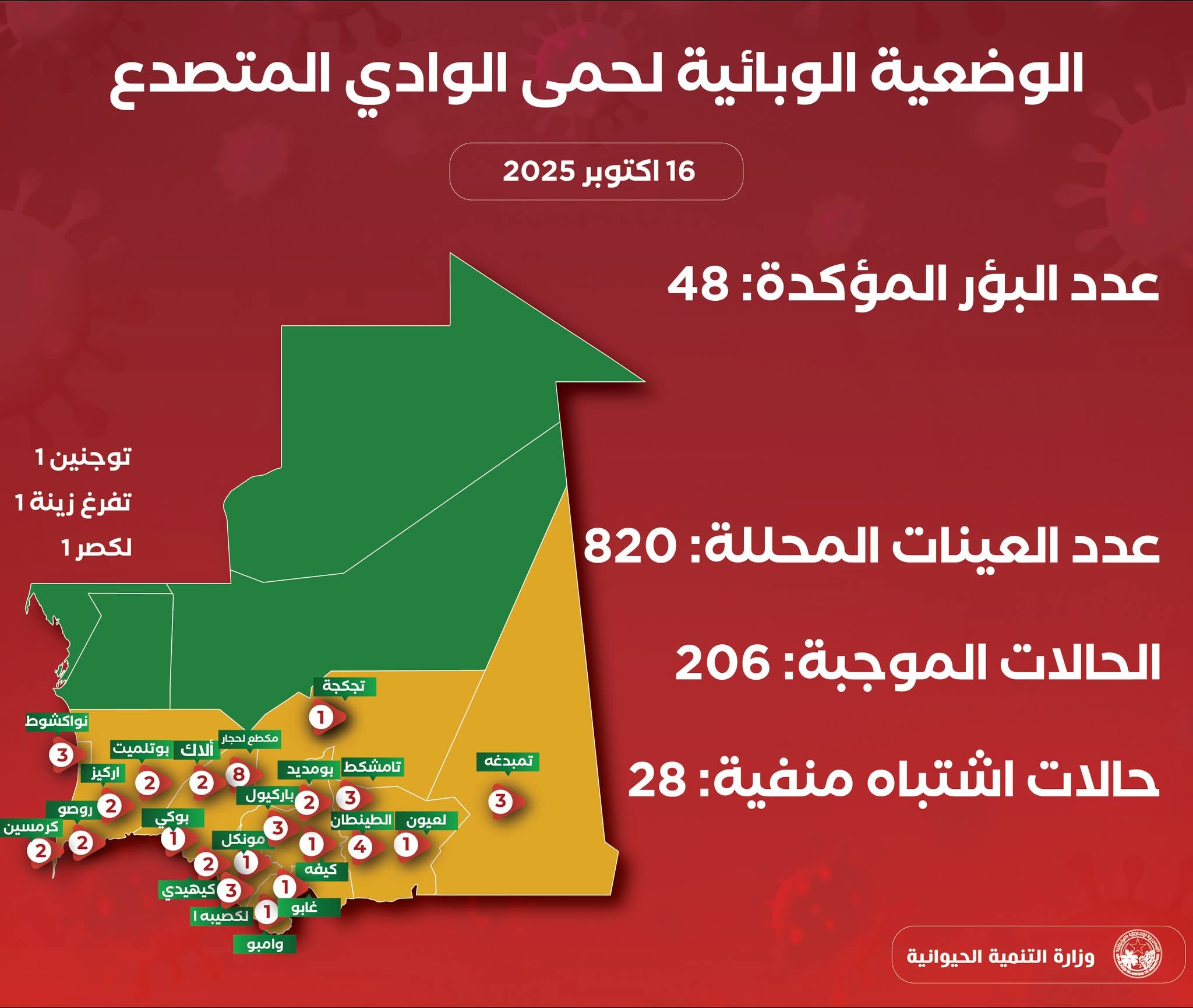 قالت وزارة التنمية الحيوانية إن مصالحها البيطرية، سحلت 48 بؤرة حاضنة لحمى الوادي المتصدع، موزعة على 23 مقاطعة تتبع لعشر ولايات.