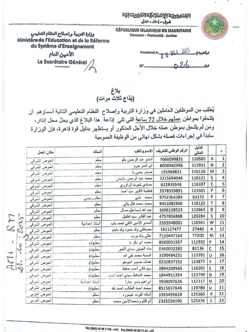 البلاغ وقعه الأمين العام لوزارة التربية وإصلاح النظام التعليمي يحي بوب الطالب، والأمين العام لوزارة الثقافة والاتصال والعلاقات مع البرلمان سيدي محمد جدو خطري.
