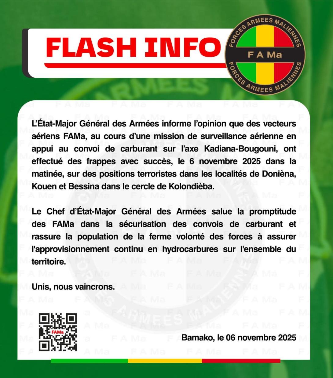 وأوضحت أركان الجيش المالي في بيان نشرته أن الغارة الجوية دعما لقافلة للوقود بمحور كاديانا بوجوني.