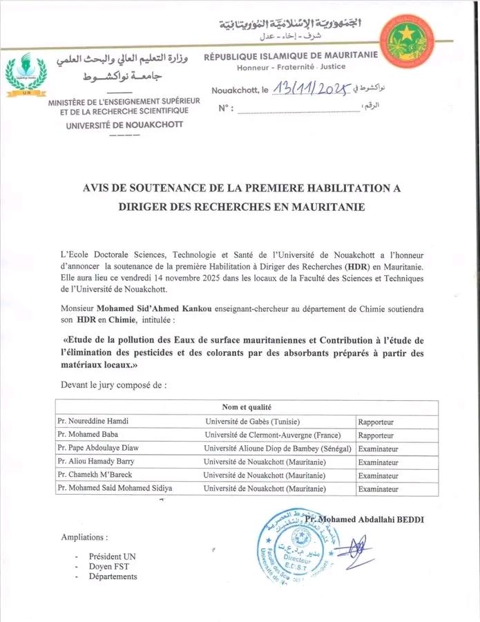 أعلنت مدرسة الدكتوراه "العلوم والتكنولوجيا والصحة" التابعة لجامعة نواكشوط عن تنظيم مناقشة التأهيل الأول للإشراف على البحوث (HDR) في موريتانيا.