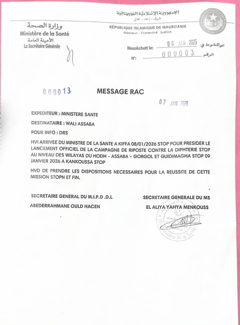 أعلنت وزارة الصحة الموريتانية عن إطلاق حملة وطنية لمكافحة الدفتيريا، انطلاقًا من مدينة كيفه، تحت إشراف مباشر من وزير الصحة.