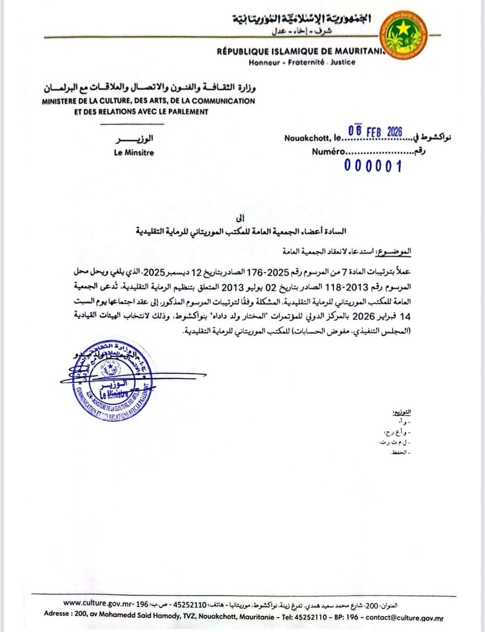 دعت وزارة الثقافة والفنون والاتصال والعلاقات مع البرلمان أعضاء المكتب الموريتاني للرماية التقليدية إلى الاجتماع من أجل في جمعية عمومية لانتخاب هيئات المكتب القيادية.
