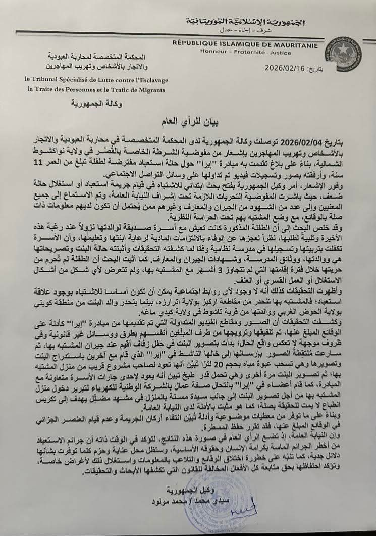 "بتاريخ 04/02/2026 توصلت وكالة الجمهورية لدى المحكمة المتخصصة في محاربة العبودية والاتجار بالأشخاص وتهريب المهاجرين بإشعار من مفوضية الشرطة الخاصة بالقُصَّر في ولاية نواكشوط الشمالية، بناءً على بلاغ تقدمت به مبادرة "إيرا" حول حالة استعباد مفترضة لطفلة تبلغ من العمر 11 سنة، وأرفقته بصور وتسجيلات فيديو تم تداولها على وسائل التواصل الاجتماعي.