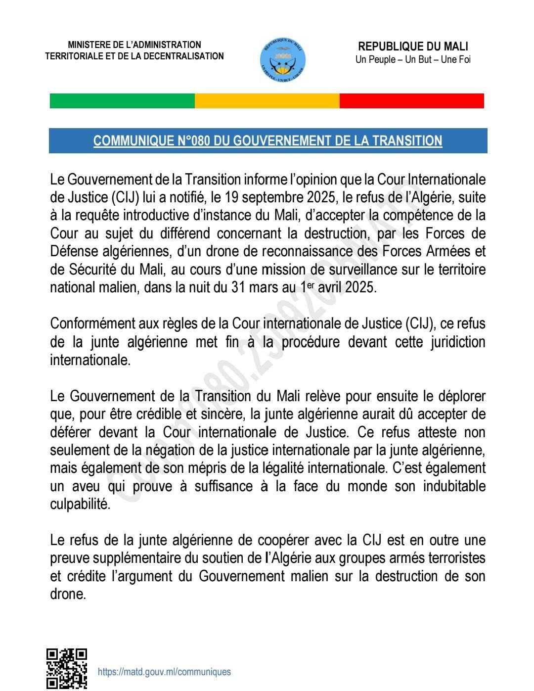 قالت السلطات المالية إن الجزائر رفضت المثول أمام محكمة العدل الدولية في قضية تدمير مسيّرة تابعة للجيش المالي مضيفة أن ذلك دليل إضافي على دعمها للجماعات الإرهابية المسلحة.