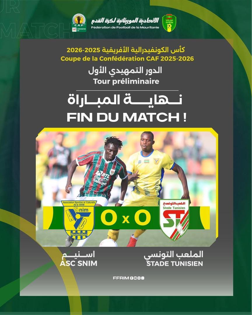 ودع نادي اسنيم الموريتاني الدور التمهيدي من بطولة الكونفدرالية الإفريقية لكرة القدم بعد تعادله السلبي مع نظيره الملعب الرياضي التونسي