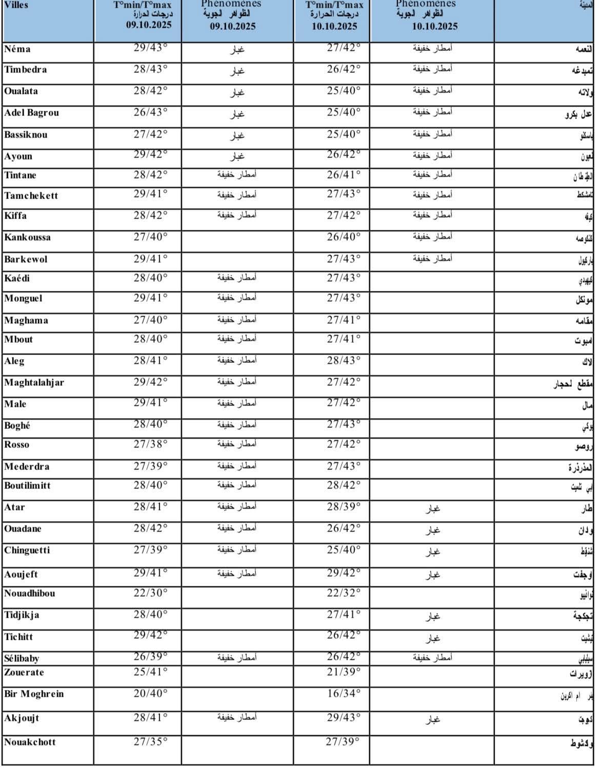 وقالت الهيئة إن الأمطار ستكون خفيفة الى معتدلة على الحوضين وجنوب اترارزة و لبراكنه وإينشيري وآدرار وكيدي ماغه وكوركول ولعصابة وتكانت